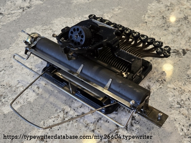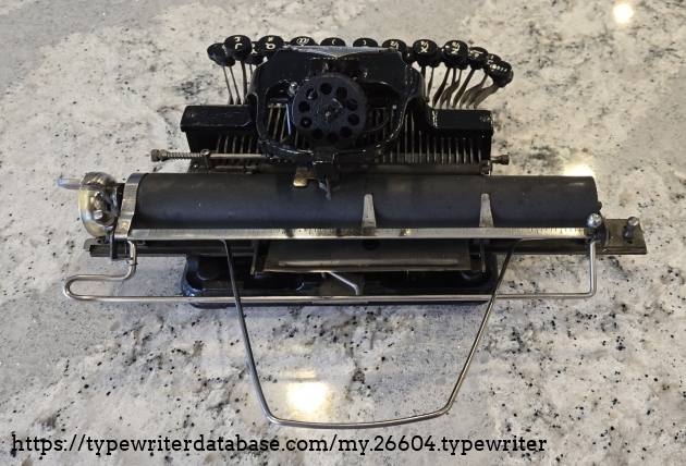 Once owned by Bob Aubert. A very early Blickensderfer 5 with a nameplate and not a decal. Has FIGS/CAPS shift keys, they soon switched to SHIFT/SHIFT as the shift keys and then by early 1896 went to FIG/CAP. It also has the early tabulator. At this stage the Blick 5s were still evolving. This one has a different paper scale