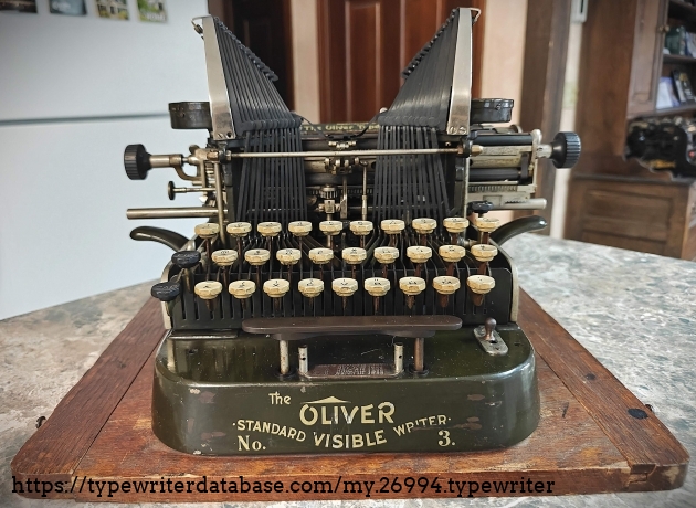 I won this Oliver 3 in an eBay auction in March or April of 2001. My winning bid was $83.75, and with $20.79 shipping costs, my total came to $104.54. It came with its original case and wooden base. The machine has not been restored, and needs a lot of work, but it looks good cosmetically, and I was able to produce a typing sample with some effort. The biggest problem is that the star wheel is missing a tooth, so that it skips a space periodically. To produce the typing sample, I had to back up manually, eyeball the position using the very handy index guide, and type in the missing character. Also, it's missing a couple screws for mounting the chromed typebar tower covers. The typeface is pica, looks pretty standard to me. I hope to find replacement parts for what it needs and restore it some day.