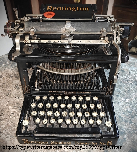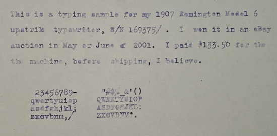 This was another relatively early eBay acquisition, in May or June of 2001, specifically, after 5/8/01 and before 6/16/01; but, beyond that, my records are sketchy. I do have a hand-written comment in an old typewriter notebook that it cost $133.50. I believe that figure did not include shipping, and shipping for large office typewriters was typically running $20-25 in those days. This machine has a 10 CPI typeface (pica, therefore; I keep forgetting to type that directly when I prepare a typing sample). This one is in pretty good unrestored condition. It has an old (ancient?) purple ribbon that produced enough of an imprint to make the typing sample. The serial number indicates 1907, starting to get near end of full production (started tapering off quickly around this time). The keys run very freely, no sticking. The feed rollers are cracked and falling apart. This is most certainly worth a restoration project, especially as Baco Ribbons seems to be able to supply fresh typewriter ribbon in this size.