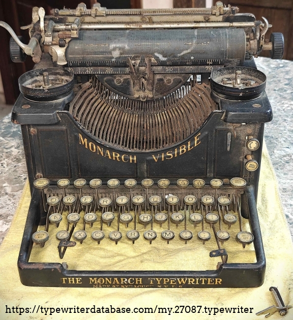 I got this Monarch 3 parts machine a long time ago, I think at the July 2002 Typewriter Jamboree in Southboro MA (hosted by Chuck Dilts and Rich Cincotta). I plan to use a few parts from it for my Monarch 3 #99868S, most notably the star wheel & pinion assembly. I have already removed it as of this posting (1/3/26), and it's in rough shape like the rest of the typewriter, but at least it turns freely. The pinion on my #99868S machine is bent. I also plan to take some springs and maybe some linkage components from the parts machine, but not much else.