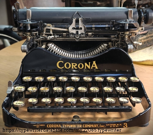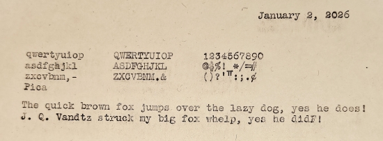 This gallery creation date (1/2/26) is the first time I have typed out a full sample on this 1916 Corona 3. It has not been restored, except for a new set of feet purchased this year, and it sorely needs the platen and rollers re-finished. As the typing sample below may suggest, the line advance does not feed the paper forward evenly, due to lack of grip on the paper by the rollers. I had to work on the escapement mechanism today, even to get it to work at all. The typeface is Pica, and disregarding the line advance issues, the characters are pretty well aligned on a line-by-line basis.