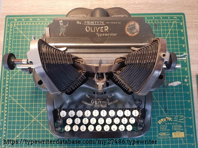 Oliver No. 9 typewriter belonging to my parents. Missing pencil holder and Tab key. Some some missing and chipped paint. Overall in good workable order.