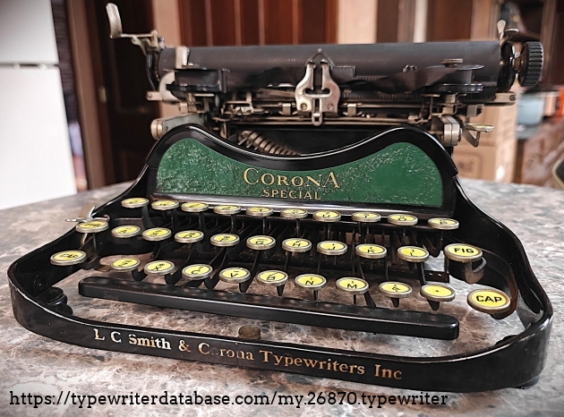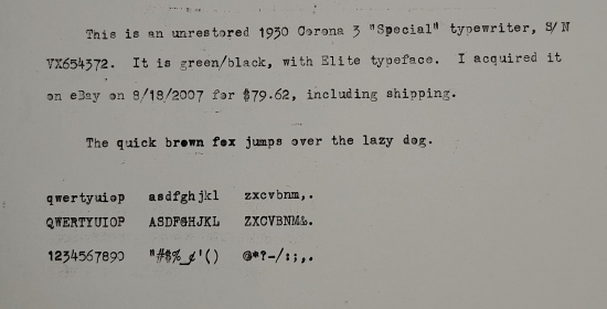 This is a green/black Corona 3 "Special" portable typewriter that I picked up on eBay on 8/18/2007. It has not been restored, except for a new set of feet, but I have been able to create a typing sample on it. It has Elite typeface.