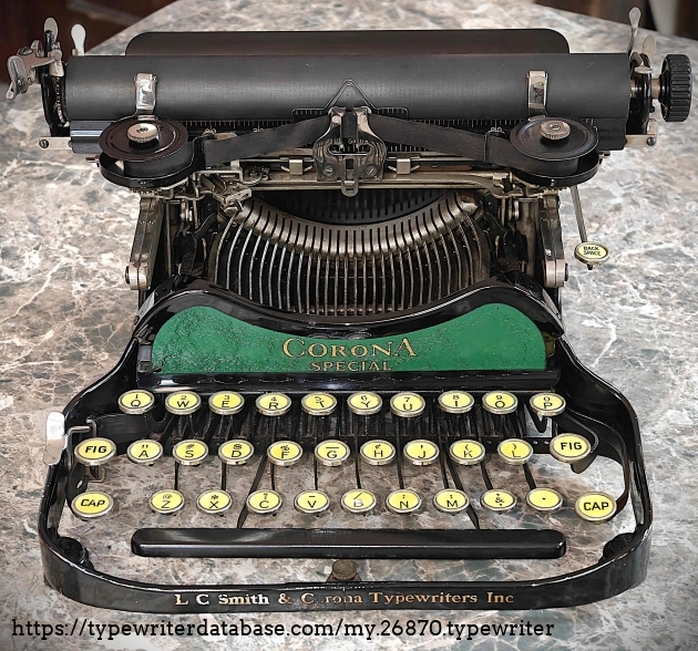 2025-NOV-28 Gallery Creation, and 2026-JAN-02 Update: This is a green/black Corona 3 "Special" portable typewriter that I picked up on eBay on 8/18/2007. It has not been restored, except for a new set of feet, but I have been able to create a typing sample on it. It has Elite typeface.