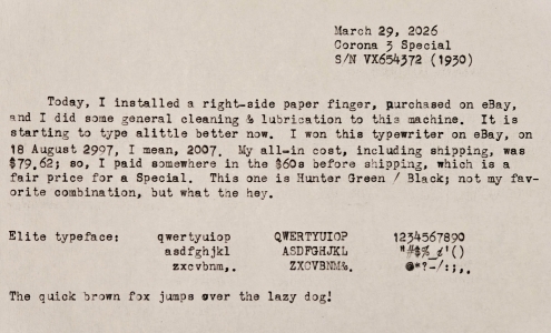 2026-MAR-29 Update. I was able to find a replacement right-side paper finger on eBay, and installed it. I did some cleaning and polishing of the body and panels. I did some mechanism cleaning, but apparently not enough. The machine types just okay, and the spacebar trips the carriage advance near the bottom of its travel, so it probably needs some adjustment.