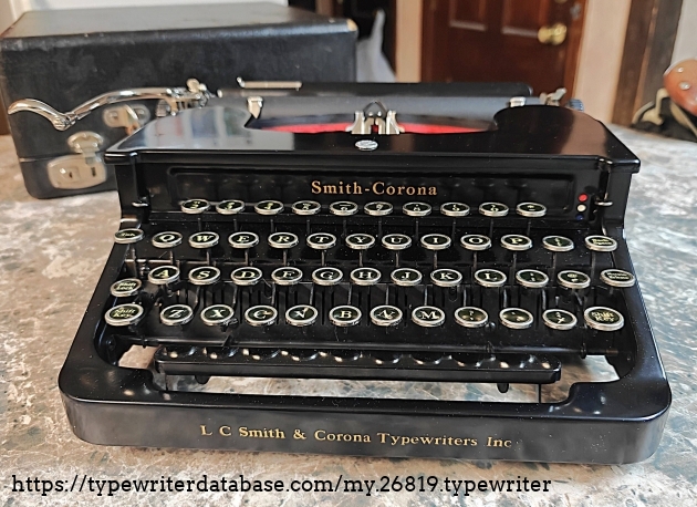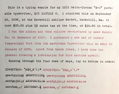 This is a 1931 S-C portable with the winged messenger medallion. I picked it up in a Haverhill, MA antique mall in 2006 for $28.00 plus 5% sales tax. I had the platen and feed rollers re-finished by Ames Supply Co. late in 2007, and I replaced the feet early in 2025. It has a Pica typeface, and is in good working order, although it could probably use a little more cleaning to remove some minor key stickiness.