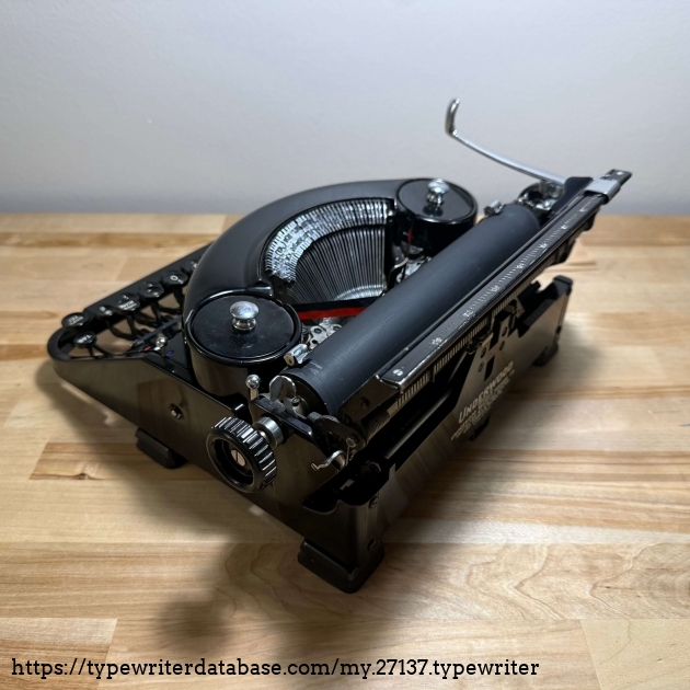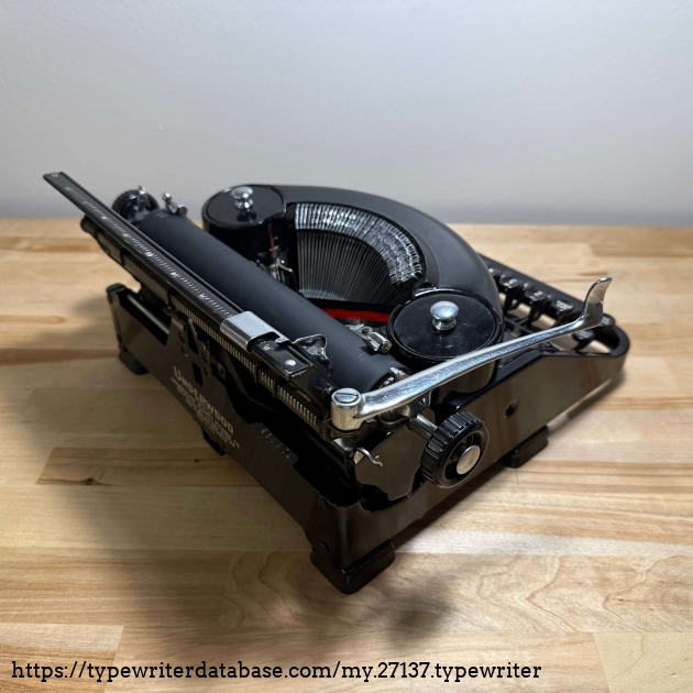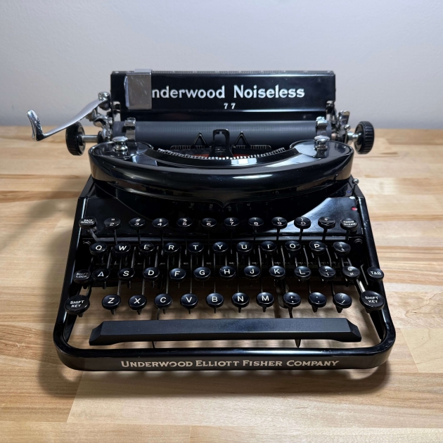 Richard Polt writes that the serial number records for Underwood Noiseless 77s are "confusing and incomplete", but based on the sequence of numbers already logged, I am assuming that mine is a 1935 model. My primary interest in this machine stems from my curiosity regarding its (and the Remington Noiseless Model 7's) "kissing" typing action.
