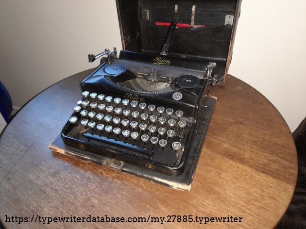 Has a British QWERTY keyboard with the pound sign, but the luggage label on the case suggests that it came to New Zealand on a passenger liner originating in San Francisco. (I believe British colonists did sometimes go to New Zealand via a trans-Atlantic sea voyage, followed by a cross-continental train through the US, followed by a Pacific Ocean liner bound for the South Seas. Are we there yet? said this Bijou.) Also, the manufacture date suggests that it's got some serious war stories to tell: a German birth, then a British adolescence, then an escape to the other end of the world.