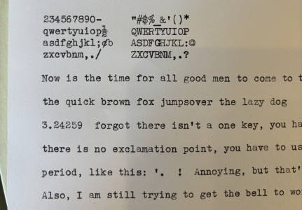 Purchased by a friend at an estate sale in decent condition, but needed some work. The carriage was stuck in the shifted position, which was fixed relatively easily. Tab stop mechanism didn't work, but I bent it back into shape. Bell mechanism was frozen, but I got it unstuck. After a thorough cleaning of the basket and picking out the type slugs, it typed beautifully with super-clean impressions and excellent feel.