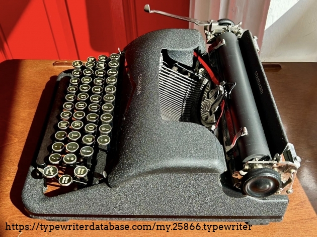 A fun little Corona Standard that I picked up at a little antique shop in the Village of East Davenport, Iowa, where I spent a lot of my childhood. So I went ahead and took pictures of it at the nearby Lindsay Park softball diamond, overlooking the Mississippi River. June, 2025.
