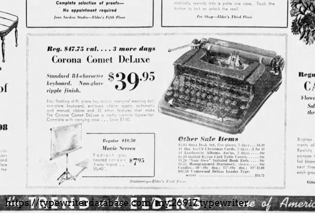 RESEARCH NOTE: When researching the Smith Corona Comet DeLuxe on a computer with lots of screen real estate, you may find that launching the Smith Corona Serial Number page and the Smith Corona Comet DeLuxe By Model/Year/Serial page in new browser windows can give you interesting perspectives on changes throughout the model series.