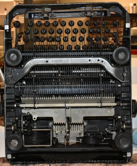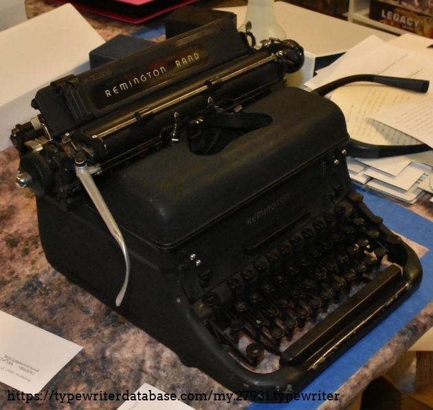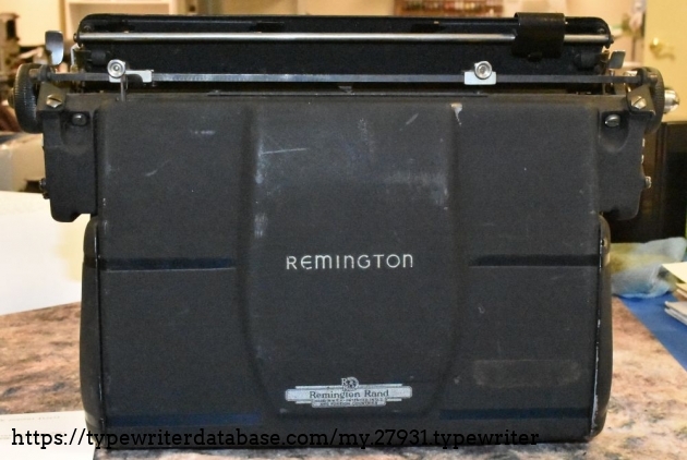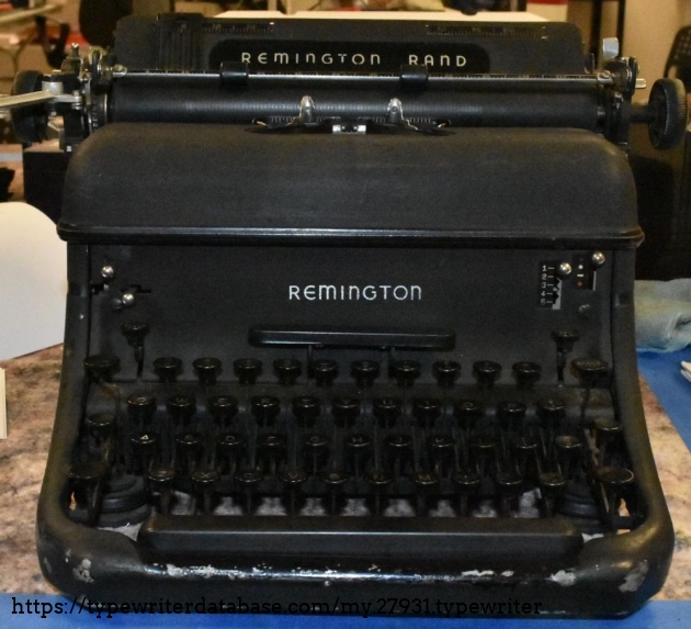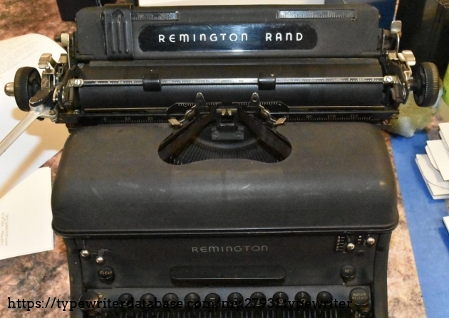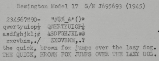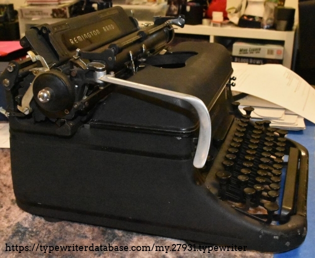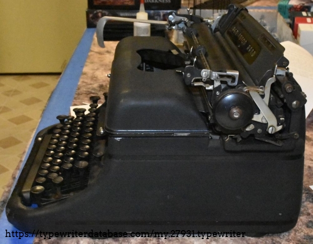My second Remington Model Seventeen. This one was made in 1945. There are some small changes, other than the obvious changes to the labeling. There is now another setting on the ribbon color selct. My older 1940 model has blue (top), red (bottom) and white (middle). This 1945 model has an additional "-" setting between the white and red settings. Not sure what it does. I suspect it might be middle of the ribbon - I will find out when I get a new two-color ribbon. This one also seems to have two of the Remington-specific ribbon bobbins. My other one had only one.