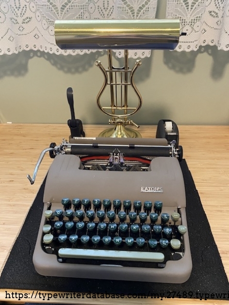 A Smith Corona Sterling, re-badged for the T.E. Eaton Company (Eaton's) for sale in Canada in 1955. It has the 'EATON'S' logo on the ribbon cover as well as embossed stripes similar to those found on the SC 'Silents' of that era. The ribbon covered had a large blob of whiteout and pencil markings which cleaned up nicely.