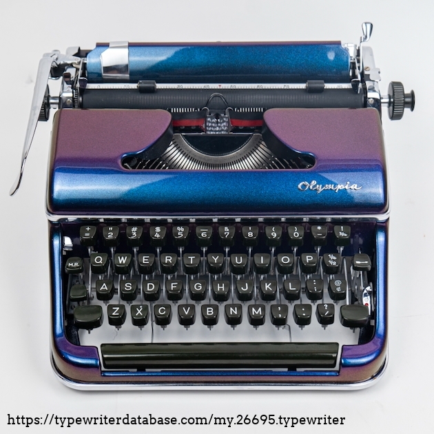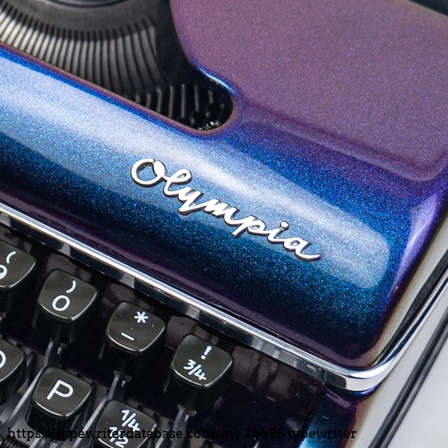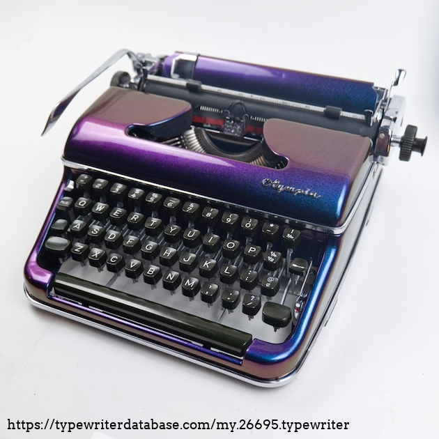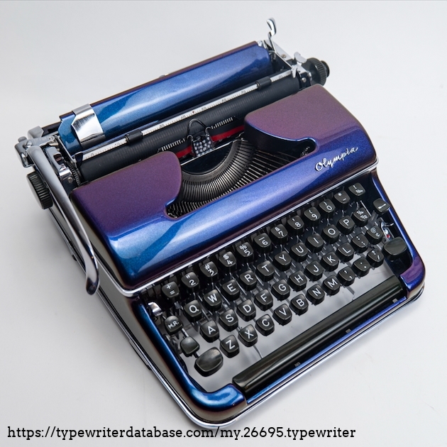 This Olympia SM2 from 1954 has been repainted by Gerren of Hotrod Typewriters. He used Elixir Supershift paint, which changes colors between blue, purple and gold depending on the viewing angle and the angle of the ambient light. I requested this particular paint since these are some of my favorite color combinations.