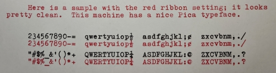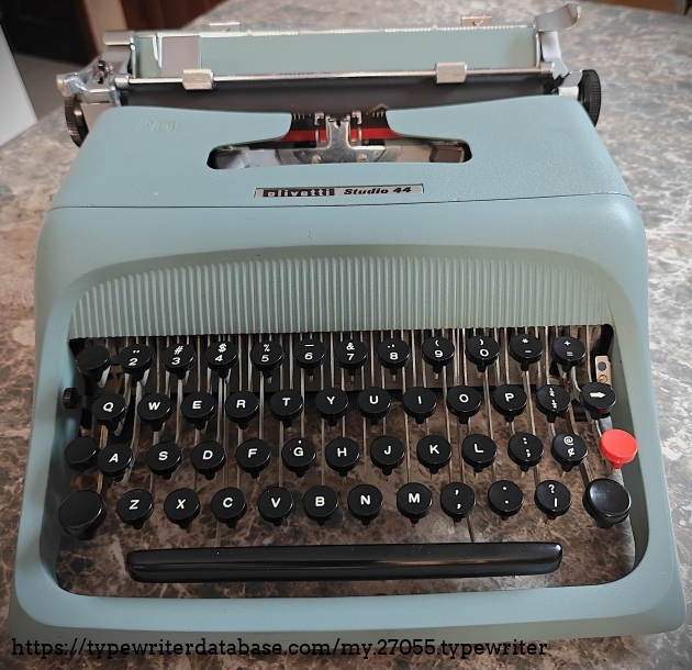 I was given this Ivrea-made Olivetti Studio 44 in 1999, some time after June 12, by Emeritus Professor Don Hill of The University of Georgia. This is one of about nine machines (five of which are still in my collection) that were given to me on account of my expressing interest in old typewriters. This one had its platen and feed rollers re-surfaced by Ames Supply Co. in April of 2008. The old feet were cracked and no good, so I also purchased a set of 3-D printed (TPV) feet for it in 2025. It still needs a set of new rubber washers for the body-to-frame attachment points, and it could probably use a more thorough cleaning. However, it types very well, with a Pica typeface. It came with the instruction booklet, and Olivetti cover, and a case which, unfortunately, no longer has its handle.