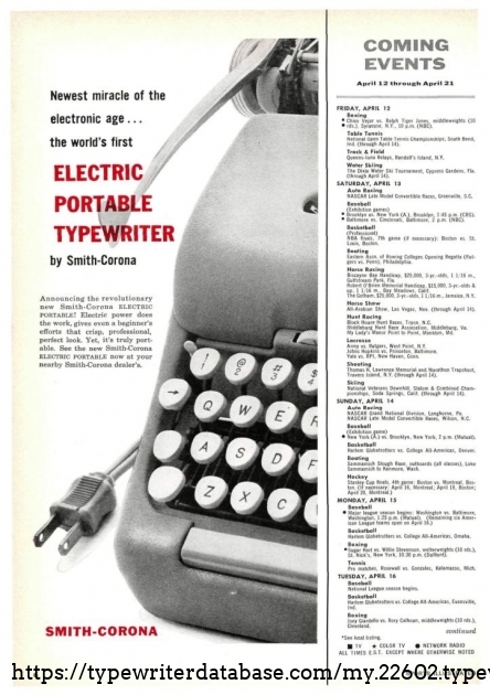 RESEARCH NOTE: When researching the Smith Corona Electric Portable on a computer with lots of screen real estate, you may find that launching the Smith Corona Serial Number page and the Smith Corona Electric Portable By Model/Year/Serial page in new browser windows can give you interesting perspectives on changes throughout the model series.