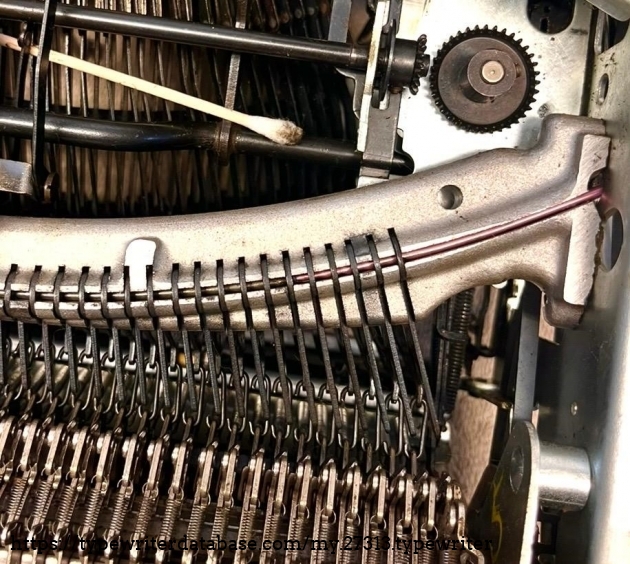 I found the bracket screws inside the machine, and a fellow collector sent me a type bar to replace mine with. I performed a very successful surgery changing out the type bar, which boosted my experience and confidence as a repair person. I chased the fulcrum wire with a knitting needle (pink in the picture) to hold things together as I worked my way to the b-key.
