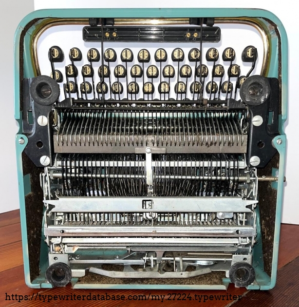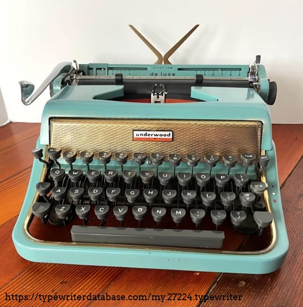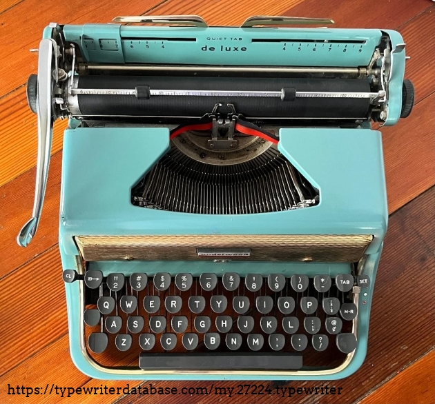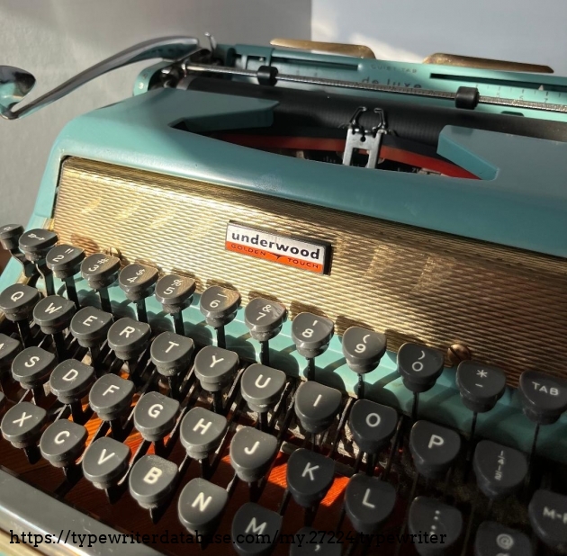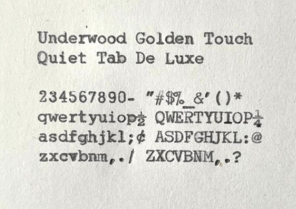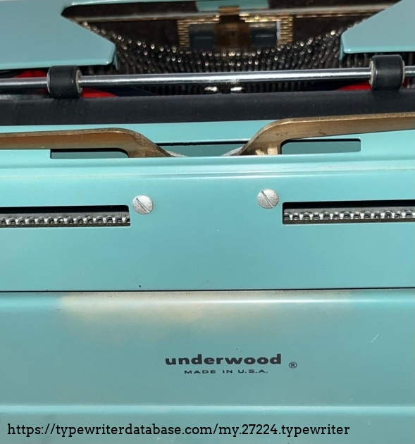 The color drew me to this one. Even though various shades of blue are common in the world of typewriters, this one stands out, especially with the gold colored face plate and gold rabbit ears for a paper rest. Like others (Royal FP, some QDL's), you push the Underwood logo to "pop the hood." The typeface makes for an attractive typed letter.