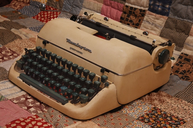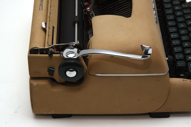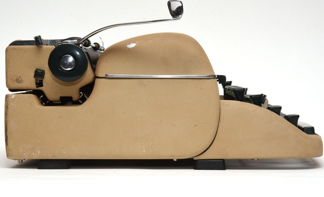 Another Quiet-Riter. This one in a pleasant buff/tan color with dark green keys. Repaired ready to type.