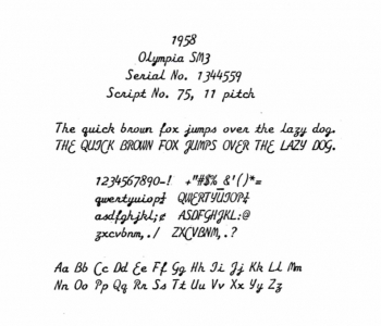 We found this in a small antique store in Florence, Oregon. It was tucked away in a closed case, but I recognized it as an Olympia case. Peeking inside we discovered that it had a script typeface which we have been wanting. Overall, it was in good shape, but the carriage return was not smooth and it seemed to get hung up. We were able to get the price reduced due to this. Thankfully, it was an easy fix. Like many SM3s the rubber bushings on the bottom had compressed over time. We replace these, cleaned it up a bit and now it works well. Research showed that it has the Olympia Script No. 75 typeface. The case included the key and is also in decent shape, but the metal parts including the latch have some rust.