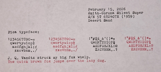 2025-11-30 Original Gallery Creation and 2026-01-01 Update: This is my 1959 Smith-Corona Silent Super portable typewriter, S/N 5T 682407X. It is in the Desert Sand color scheme. I found this machine for $15 plus $0.75 sales tax at the Haverhill Antique Market, Haverhill, MA, on January 28, 2007. It has not been serviced, and one or two keys are a little sticky, but it basically runs pretty well. The typeface is Pica, which I neglected to include in the abbreviated typing sample. It could use a little type alignment. Just recently, I installed a new set of feet purchased from Type Space in Portland, OR. This typewriter was owned by a student at Springfield College, Springfield, MA at one time, as indicated by the property fob attached to the holiday case that came with the machine.