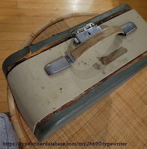 Father Tom (original owner). Purchased 10.23.2025 at an antique mall in Las Vegas. Missing the set key. Case is in rough shape. Carriage doesn't return properly. Only using the backspace key works to move the carriage back. Senatorial typeface. #Olympia #SM4 #Germany #green #1960s