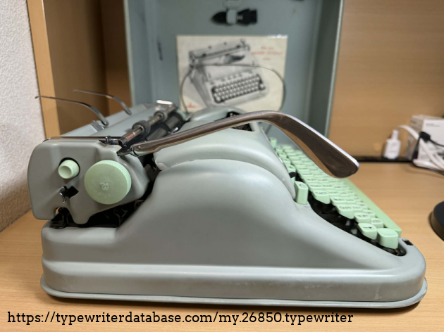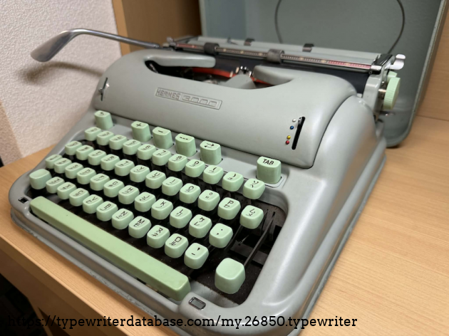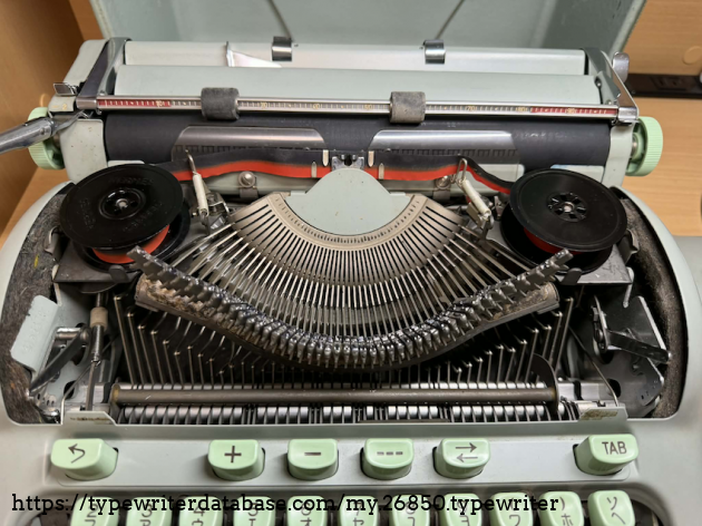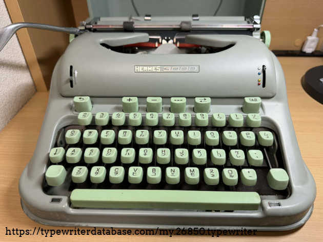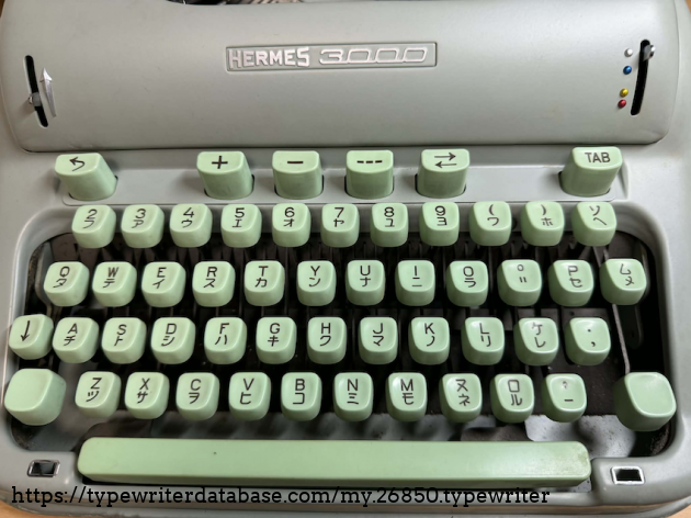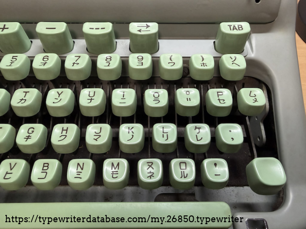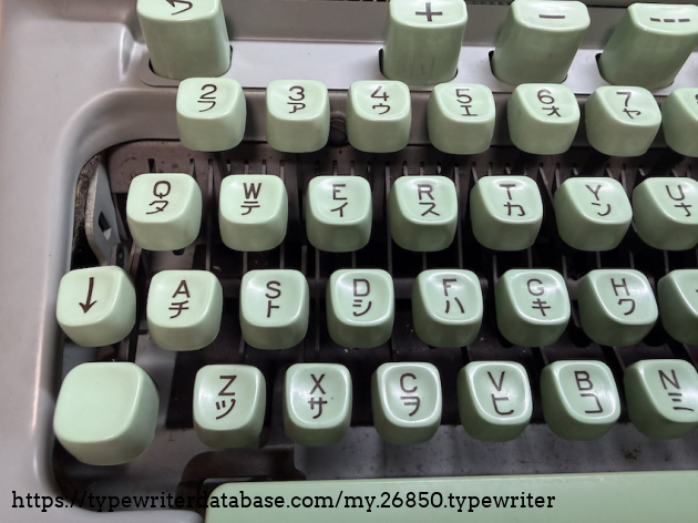This is a dual language typewriter, with QWERY and Japanese katakana keys used in spelling foreign names. The machine still works well despite its age. And the seafoam color is a darling!