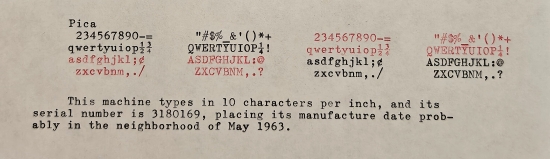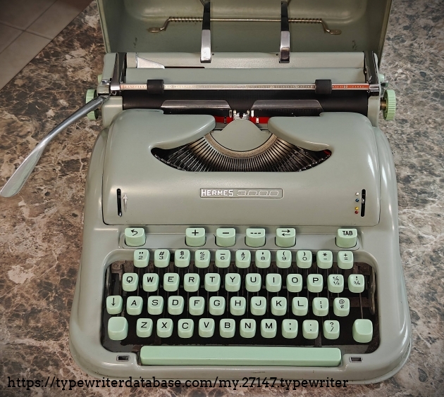 This is only the 2nd Hermes machine ever to be in my collection. The first was a 1960 Hermes Rocket, S/N 5776148, without its case, which was given to me in 1997 or 1998 by a colleague in graduate school, whose family had found it in a house they had recently bought in Baxley, GA. I didn't get on with the little Rocket. I found the keyboard to be a bit cramped, and the action a bit mushy for my taste. So, eventually, I gifted it on to someone else. Therefore, this Hermes 3000 is the only Hermes machine in my collection. It types great, as well it should given it was serviced by a typewriter shop and cost a mint; the typeface is Pica. The serial number, 3180169, implies a manufacture date somewhere around May of 1963, assuming a linear production rate and correct data in the TWDB.