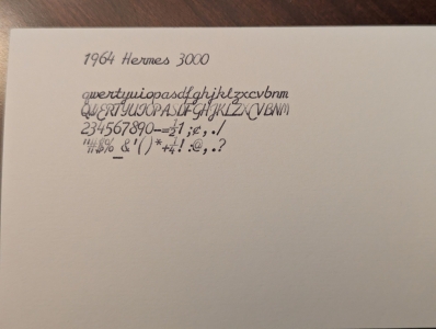 Hermes 3000 in nice shape. It needed some cleaning when I got it (it was full of KoRecType dust), but once cleaned up it is in great shape. Came with the original brushes and manuals. Script typeface.