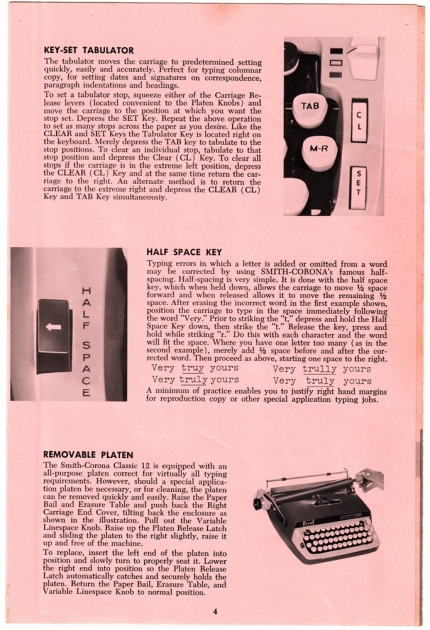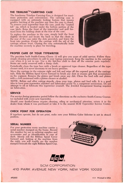RESEARCH NOTE: When researching the Smith Corona Classic 12 on a computer with lots of screen real estate, you may find that launching the Smith Corona Serial Number page and the Smith Corona Classic 12 By Model/Year/Serial page in new browser windows can give you interesting perspectives on changes throughout the model series.