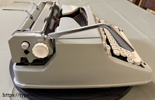 Purchased on eBay. This is one of my youngest typewriters as I fall out of love with machines that were built in the 70's or later, they just aren't as good IMO. It was missing both platen knobs when I bought it so I purchased 3D printed replacements that seem to work fine. I will keep an eye out for factory original replacement platen knobs in the future. S7 Elite typeface. As Hermes is famous for, the action on this machine is indeed best described as "buttery." It may not be everyone's cup of tea but I enjoy it a great deal. So far, this is the only machine that has not needed any service or adjustments, other than the missing platen knobs it has worked perfectly from go. Tom Hanks has an almost identical machine to this one that he posted on Instagram from the Dodgers (cough-cough, go padres!) Opening Day. I believe this makes us typewriter twins with all the rights and privileges that entails.