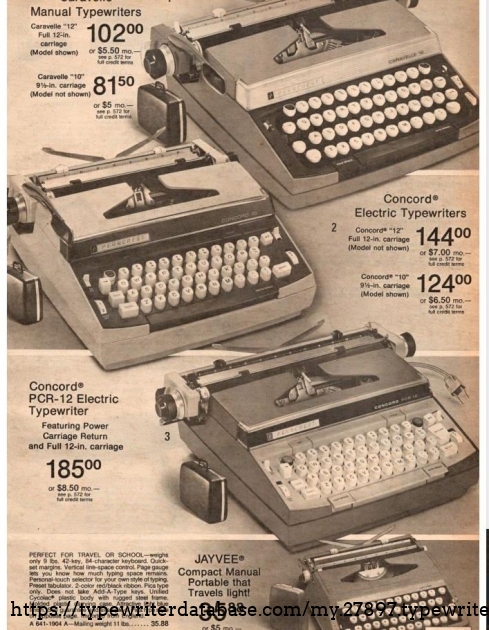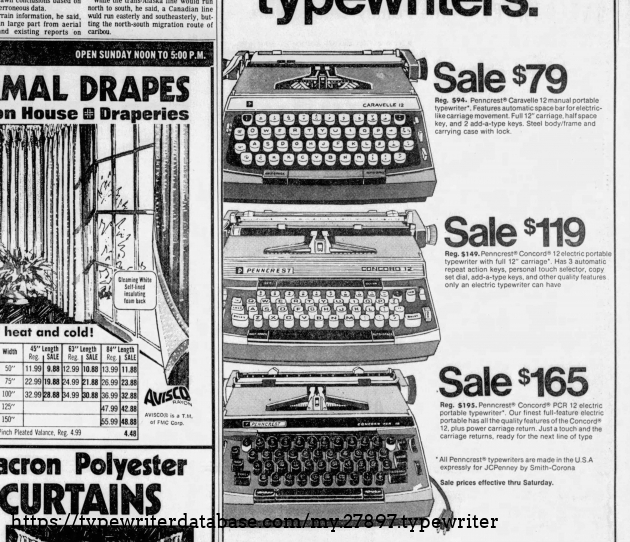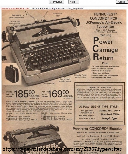 New in the catalog for 1970. The PCR 10 is in the 69 catalog. These are JC Penney's version of the Smith Corona Electra 220. Following SC's typical pattern, the dealers get the new models (210/220) for a few years before they are rebadged for the department stores. In 73 they rolled out a newspaper campaign.