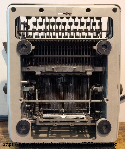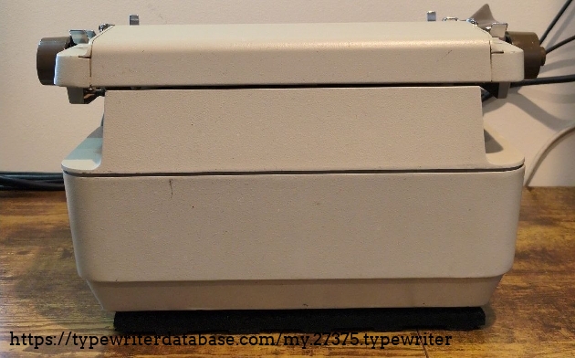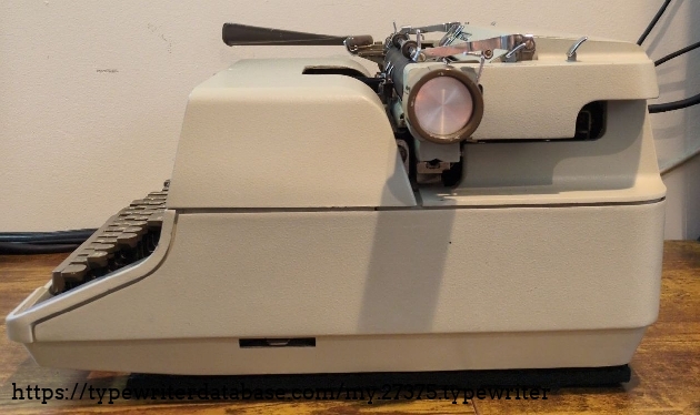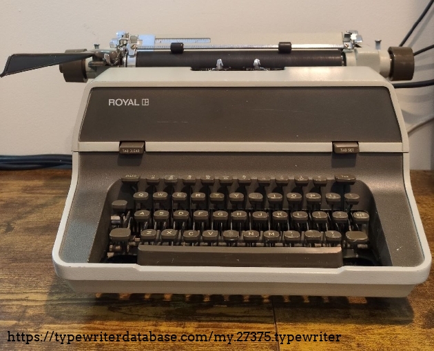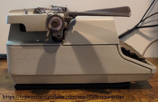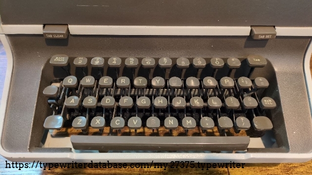 Types with all of the ease and feel of a Royal standard machine but the big empty case gives it a somewhat rattling, hollow sound while in use. As you can see it is the classic Royal standard machine with a steel skeleton shoved in a huge shell. Lovely 70s styling and colors! Missing the ribbon color selector knob on the right side but I will eventually get a parts machine to replace it.