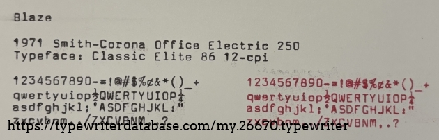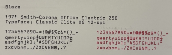 My second electric-assist typebar machine is also my first typewriter with a techno-like typeface. Officially it is Classic Elite 86 12-pitch and I admit, it is pretty nice. It also has electric carriage return which it does with some amount of force. It is good thing the carriage is connected to the machine or your are apt to break a window. Because it is a wide-carriage machine it comes in a Platt case that works very well. I don't know if I will be getting any more electric machines in the future but then again, I don't know if I will stumble across any machines as nice as Blaze.