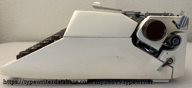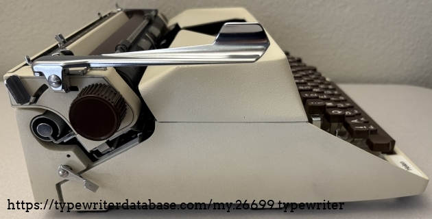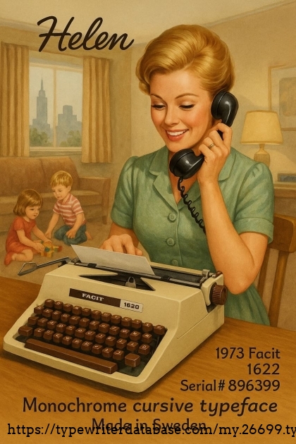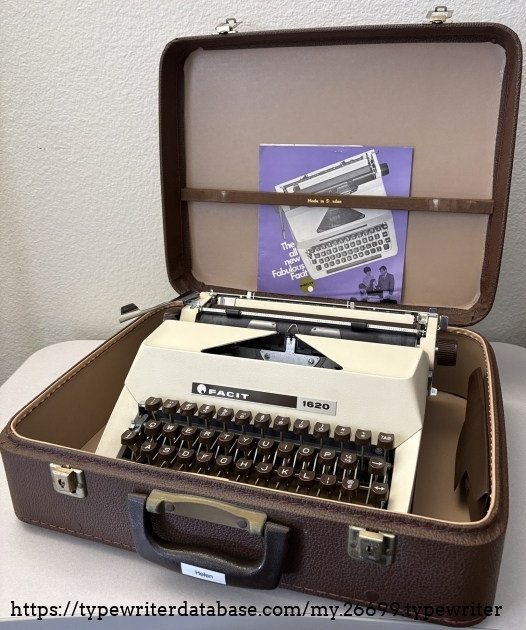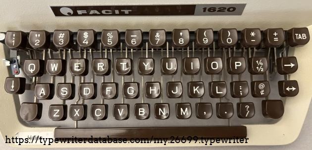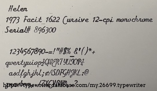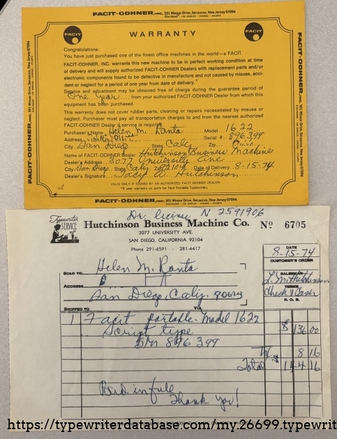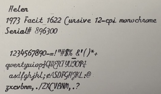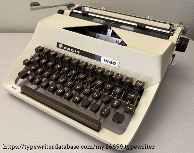 I am changing my rule~from no machines after 1969 to no machines after 1975, we will see how far that gets me. Helen is, as many are, named after its lifetime owner. Helen R. purchased her Facit typewriter new on August 15, 1974 at Hutchinson Business Machine on University Avenue in San Diego, Helen's hometown and mine. She cared for her typewriter for 40 years until her passing May 2014 at the age of 95. Her case still includes the original purchase receipt and warranty card. Both documents indicate that the model is "1622" even though the ribbon cover is adorn with "1620" so I assume 1622 is a sub-model along the lines of Royal "HHP" and "HHE." I will do a little more research on the model number as that is clearly not a mistake. The form and color scheme scream 1970's, beige body and brown keys, very handsome for its time. Helen is a cursive machine and the action is smooth and enjoyable. The rail carriage is butter smooth, it glides effortlessly.