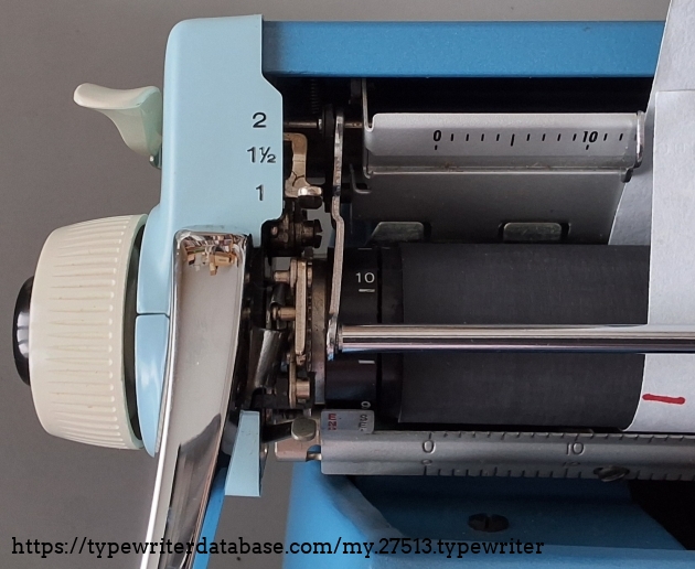 This is a basic mechanism with a tab function that is keyboard set with buttons on the right. No half spacing, no Select-a-Type, no de-jamming key, not even an eraser table nor a paper rest, but yes, finally, 1 1/2 line spacing!