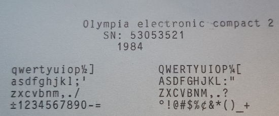 RESEARCH NOTE: When researching the Olympia Electronic Compact 2 on a computer with lots of screen real estate, you may find that launching the Olympia Serial Number page and the Olympia Electronic Compact 2 By Model/Year/Serial page in new browser windows can give you interesting perspectives on changes throughout the model series.