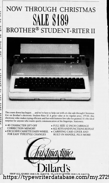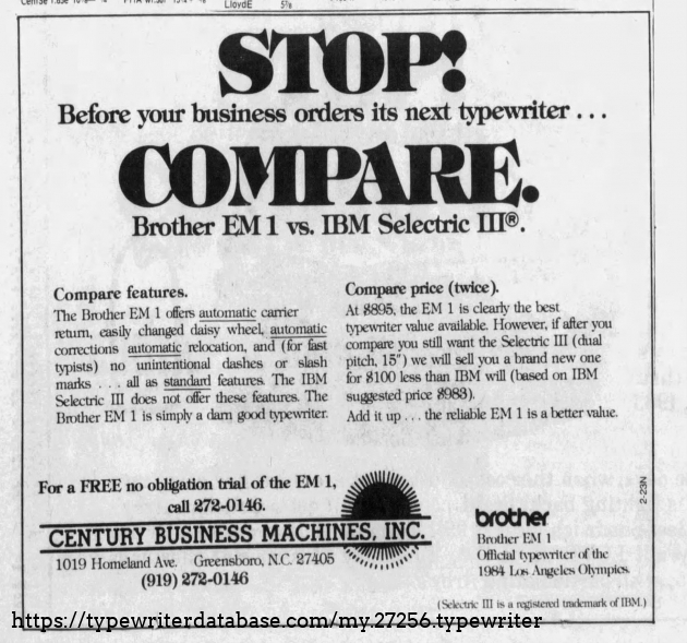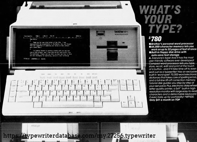 The AX series are the first of the wedge machines ca 1985. A huge price drop from the EM-1/2 models, which are marketed as inexpensive alternatives to the Selectric III. They also come in under the price point of the first word processor, the WP-1 / WP-500 . Brother also as the typeball machines. Things are in flux to say the least.