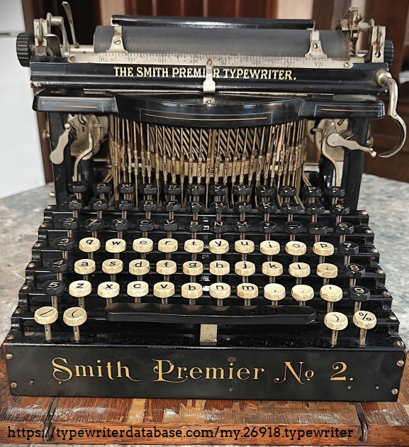 This is my 1905 Smith Premier Model 2, S/N 97998. It is one of the only three office typewriters in my collection that came with its metal case. I won this in an eBay auction on February 5, 2007; my credit card records indicate that it cost me $148.50 all-in, including shipping. Given shipping was running $20-25 for big office typewriters at that time, although I no longer have a record, I believe the winning bid price was around $125. The machine has not been serviced, but the ribbon that was in there when I purchased it still leaves a faint imprint. I have replaced the feet with a set provided by Type Space in Portland, OR. Other than that, it needs new platen and feed roller rubber, and a general deep cleaning, lubrication, and adjustment, and believe it can be brought into fully operational condition.