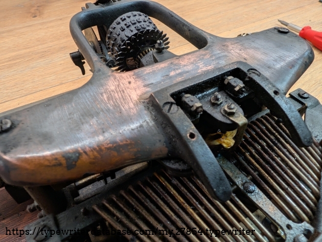 The top casting has been painted over in the past. This paint is coming off very easily and will be removed completely when I get to restoring this machine.