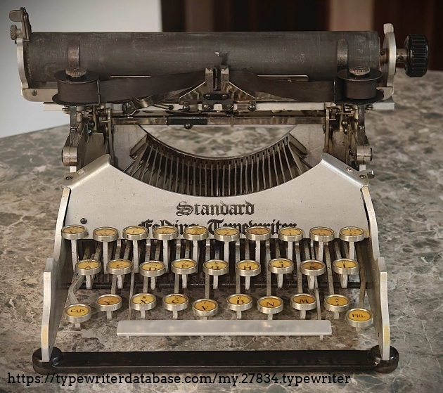 The seller was (and is) the proprietor of the Kountry Treasures eBay shop, based in West Plains, MO. The machine belonged to her dad, who passed away 20 years ago. It was sitting in a closet since then, as the seller was hoping one of the grandchildren would want it. Not to be. So, she listed it on eBay, along with another folding typewriter that had belonged to her dad. I looked for that one on eBay, but it must have sold before I noticed this auction for the Standard Folding. The lady listed it as a Standard Folding Model 2; however, it's clear from the images and serial number that, in fact, it is a late Model 1, probably manufactured in May or June of 1910.