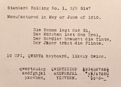 I did some cleaning of the typebar bearings with bore cleaner, to free up some key stickiness. Then I tried a typing sample, and found that the ribbon vibrator was not elevating enough, so that tall letters were getting clipped off. I learned how to do the ribbon vibrator adjustment, and was able to produce a reasonable typing sample. It has a 10 CPI font, and a QWERTZ keyboard with a character set that appears to be a Swiss layout.