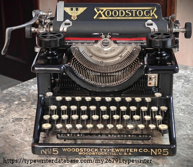 11-16-2025 Gallery Creation. I acquired this early, B-series, Woodstock Model 5 on eBay on 24 September 2006. The cost to me with shipping was $47.96. I had the platen and rollers re-surfaced by Ames Supply Co. in December of 2007. I also installed four new replacement feet. Otherwise, it has not been serviced and has a number of sticky keys. One curiosity is the Margin Release control is labeled "LINE-LOCK RELEASE". I have another Woodstock Model 5, S/N BW-40431, which has the same key labeled "MARGIN RELEASE". I estimate the year of manufacture for the latter one to be about 1919, so the change-over from "LINE-LOCK RELEASE" to "MARGIN RELEASE" apparently happened in the 1918-1919 time frame.