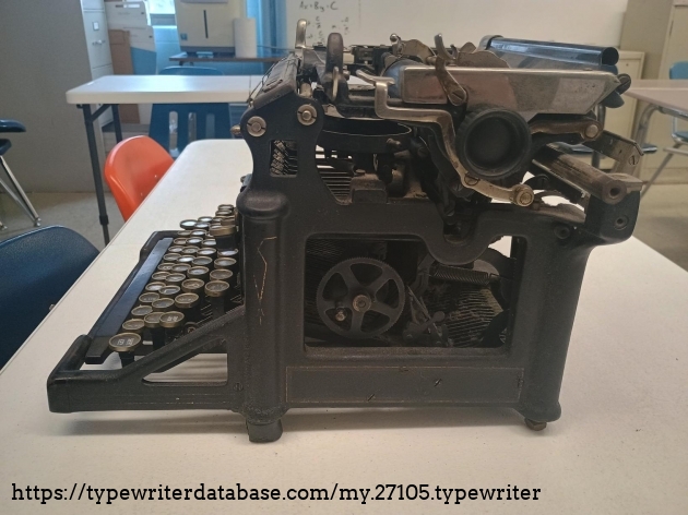 A dirty 1919 No 5 that had a misaligned carriage, missing feet, sad rollers, and some other issues. It has decals with 1920s patents, so I think it was refurbed at some point. These are the "before" shots.