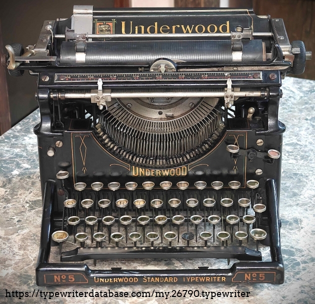 This Underwood Model 5 has an unusual typeface (see attached samples); I do not know what it is called, but it is 10-pitch, so maybe in the Pica family. I purchased it for $40 at Treasures Antiques & Collectibles in Amherst, NH, on 3/29/2008. This was one of the last two typewriters I purchased, both on 3/29/08, before I stopped collecting for 17.5 years, until November 2025, when I bought a Hermes 3000 (see linked gallery). The other typewriter I found on 3/29/08 was my Corona Four, #2K13611 (see linked gallery).