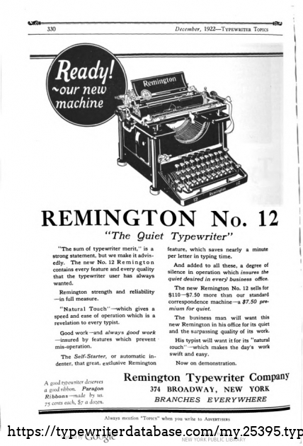 As enclosed typewriter go from the big boys, Remington catches up with Royal in 1922. Remington has the advantage, or disadvantage depending on how you look at it, by having the ribbon inside the machine. L.C Smith does the 8 in 1928. And the one-time innovator, not until the M in 1937!