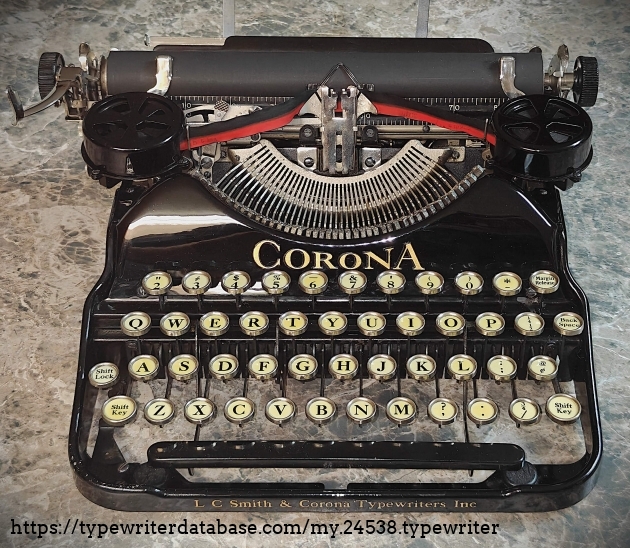 This is my 1927 Corona Four machine. It includes the warranty card, which indicates it was sold on 9/17/1926 by Grant's Book Shop of Utica, NY. However, the serial number, 4L00355, indicates a manufacture date in July-August of 1927 (more likely July, due to the low serial code, xx00355). It seems that perhaps the dealer wrote the year incorrectly, amazing though this seems, given it was mid-year, and it was a warranty card for 1 year from "date of delivery to the original purchaser". Perhaps there was excitement in the Book Shop that day due to the legendary 1927 New York Yankees heading towards the pennant?