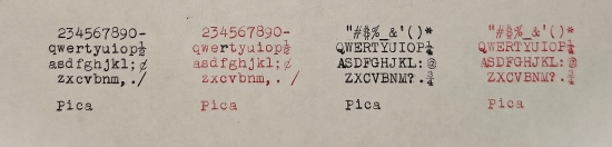The typeface is Pica, and seems identical to the typeface for my other black Corona 4 machine, #2K13611 (April 1926); see the linked gallery. These machines look very similar, but there are a lot of subtle differences between the Corona Four (#2K13611) and the Smith-Corona 4 (#4L00355). Most noticeable may be going from a bail-type paper guide to paper fingers. Also, #2K13611 has a margin release key labeled "Margin Release Right", whereas the same key position is simply labeled "Margin Release" on the later machine. Also, the direction of the paper release levers was reversed from push-back on the older machine, to pull-forward on the newer one.