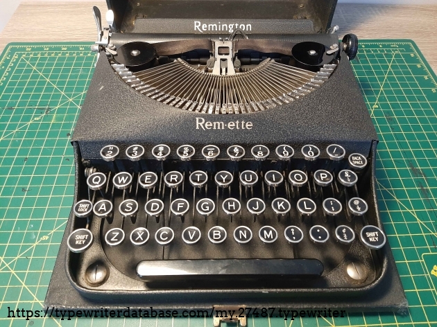 Remington Remette typewriter. Made in Canada, August, 1938. A few minor marks on the paint. Platen in good condition. Came with a worn case with some alterations. The previous owner marked the back of the typewriter with a phone number by scratching the black paint off. It types well but the feed rollers on the left side do not seem to be operating consistently resulting in the lines going out of alignment as you type down the page. It's a very small, light, and portable typewriter for its era.
