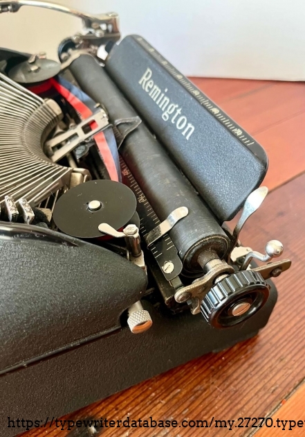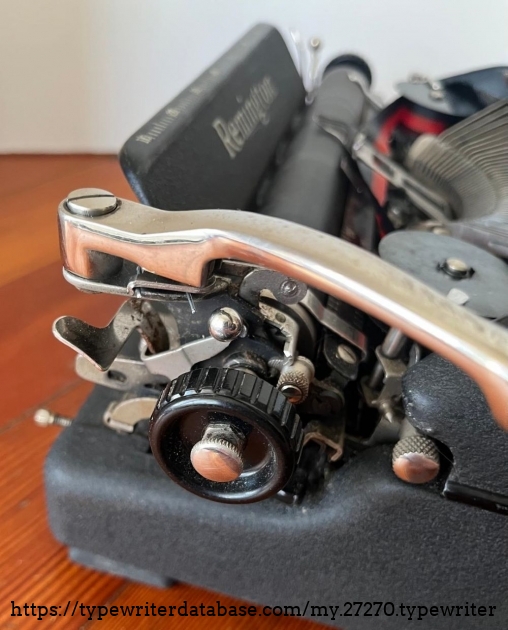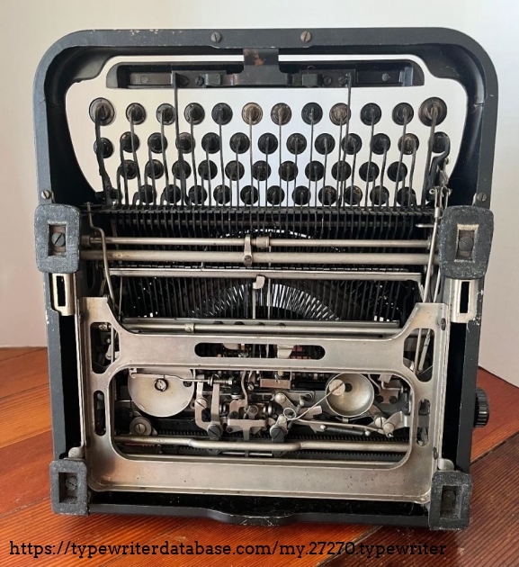Found in a damp garage with a broken draw band, missing return lever spring and a missing set screw on the RH carriage knob, it was a fun project getting it typing as well as it does. I love the action on these, where the typebars start from a practically horizontal position. A very attractive portable.